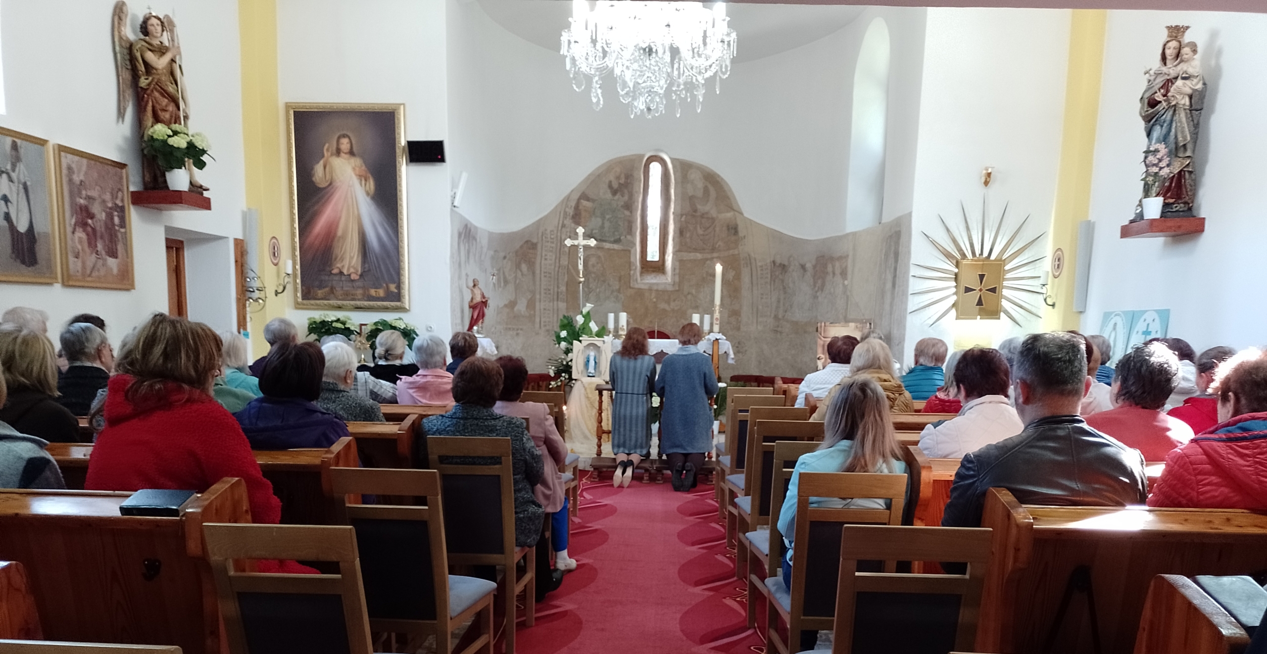 Svätú omšu odslúžil páter Ján a k slávnostnému prežitiu svätej omše prispela aj naša pani kantorka Antónia Kucháriková, Pán Boh zaplať. Po svätej omši program pokračoval v kultúrnom dome obedom. Spoločne sme pozreli film „Najväčší zázrak“ a znovu sa nám prihovoril páter Ján Jakubovič. Na záver duchovnej obnovy sme sa pod vedením sestry Gemmy pomodlili Korunku Božieho Milosrdenstva.